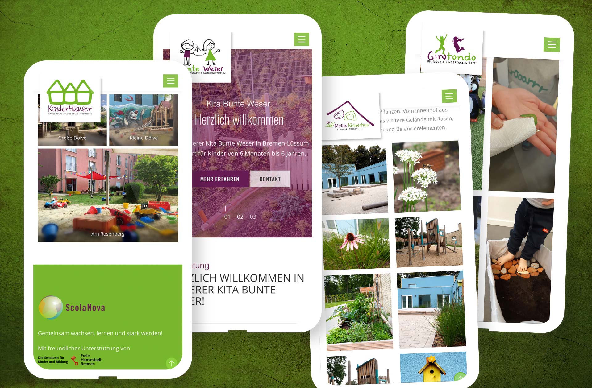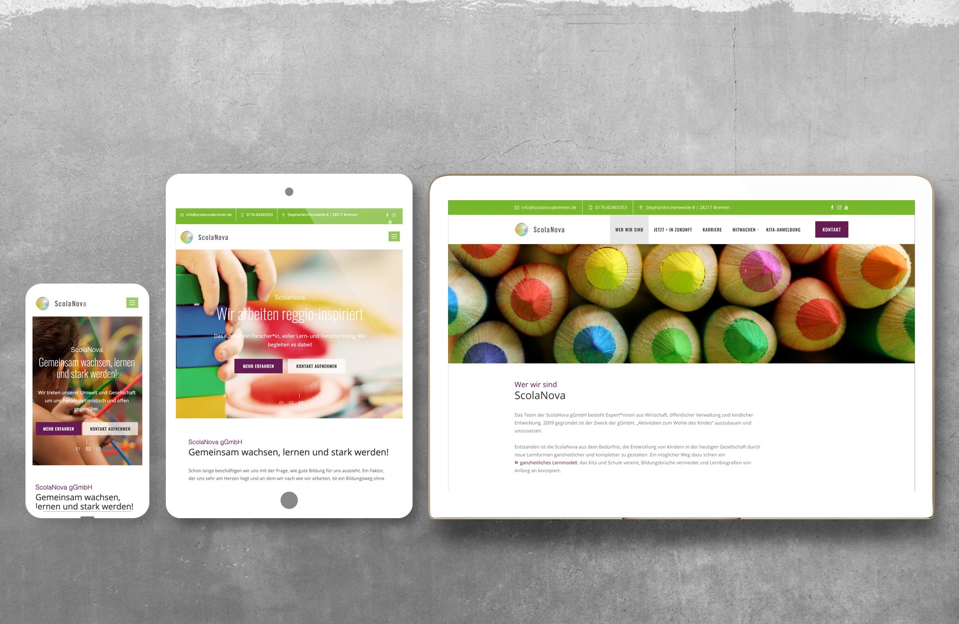 2020 wurde für drei neue Kitas des priavten Trägers »ScolaNova« jeweils ein Logo entworfen und eine Hauptwebsite des Trägers, sowie eigene kleine Websites auf Subdomais für die einzelnen Kitas gestaltet und umgesetzt.